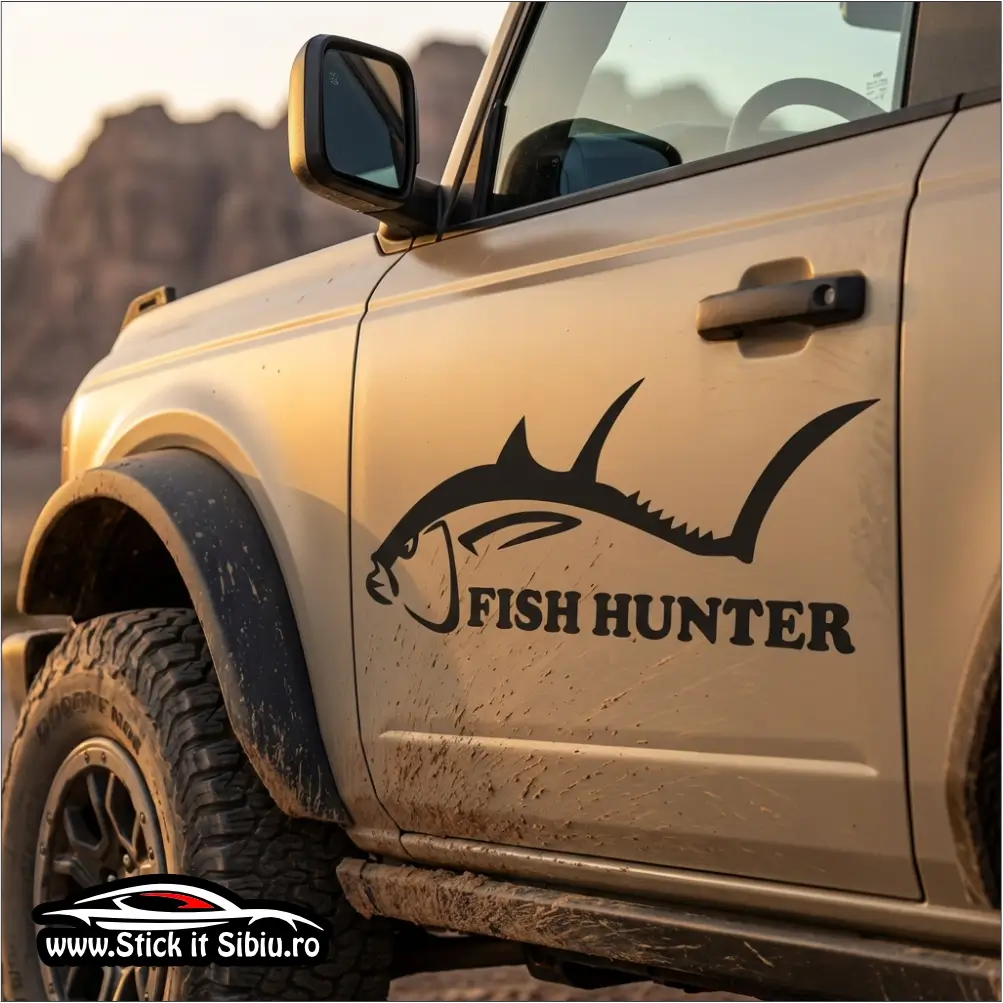 Sticker Auto „Fish Hunter” – Siluetă Pește Răpitor | Printat & Laminat – Stickere Auto