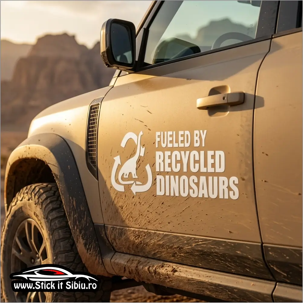Sticker Auto „Fueled by Recycled Dinosaurs” – Dinozaur Reciclat | Rezistent Exterior – Stickere Auto