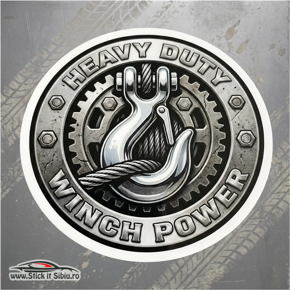 Designul circular imită perfect o placă metalică nituită, având în centru un cârlig de troliu masiv peste un fundal de roți dințate mecanice. Inscripția ‘HEAVY DUTY – WINCH POWER’ completează aspectul industrial, sugerând că vehiculul tău este pregătit pentru orice operațiune de salvare.