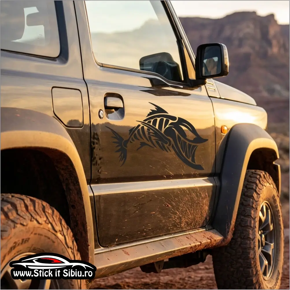Nu e doar un sticker, e un avertisment: „Bad to the bone!” Modelul prezintă anatomia unui prădător acvatic (stil Piranha) redată sub forma unui schelet stilizat. Cu dinți ascuțiți și o structură osoasă detaliată, acest design tribal/agresiv este perfect pentru pescarii care caută trofee mari sau pentru oricine vrea să adauge o notă „dark” și unică mașinii sale. Arată spectaculos pe geamurile laterale ale unui SUV sau pe lunetă.